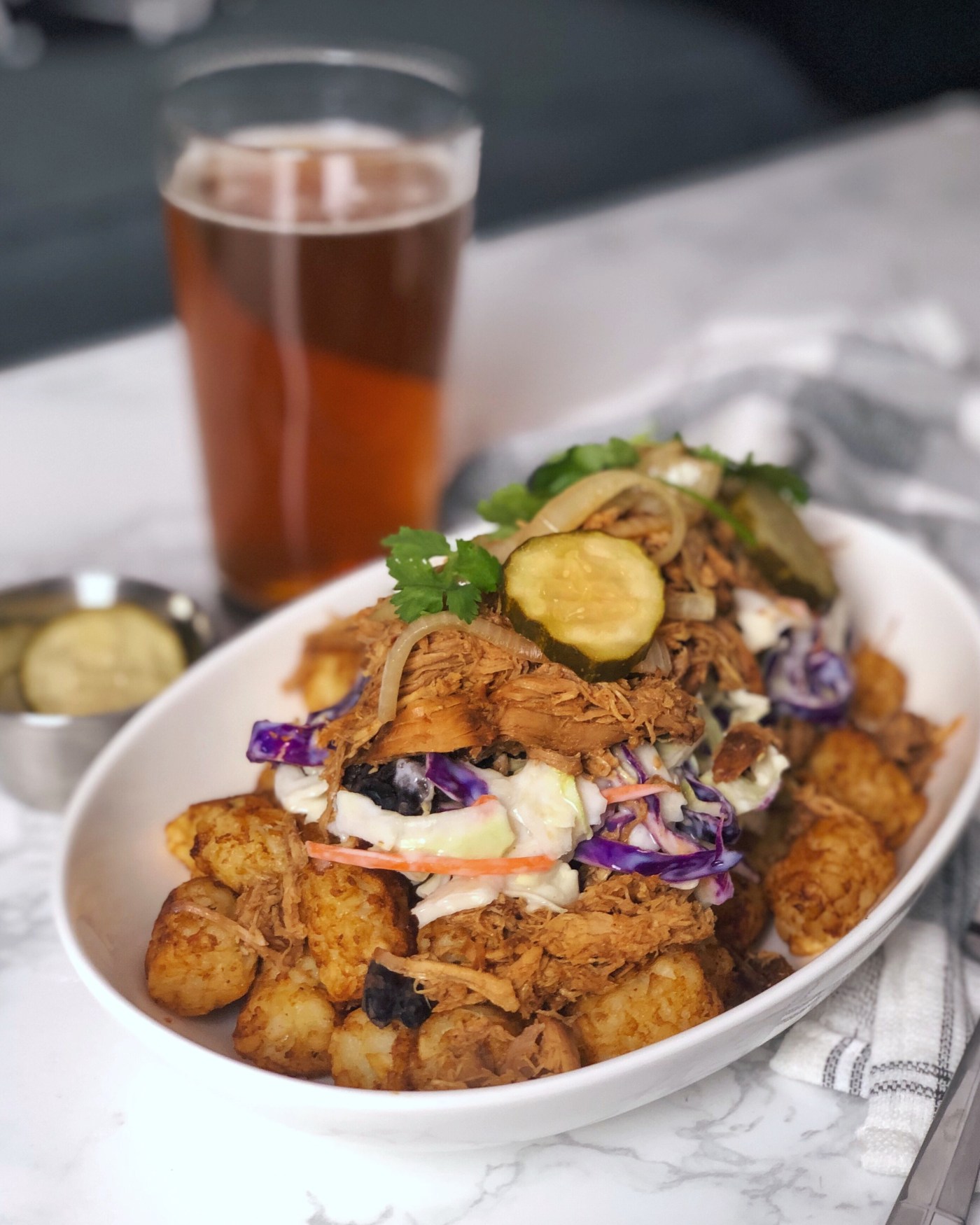 - Plate tater tots (we recommend using a long bowl) and put your shredded pulled pork on top.